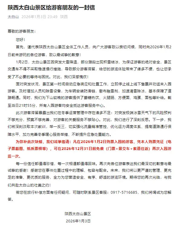 1月3日,陜西太白山景區(qū)發(fā)布給游客朋友的一封信稱,1月2日,太白山景區(qū)因突發(fā)大雪降溫,部分路段出現積雪結冰,為保證游客的絕對安全,景區(qū)交通車不得不采取穩(wěn)速慢行措施,導致部分游客滯留,對此深感愧疚。面對突發(fā)狀況,景區(qū)第一時間啟動應急響應和處置工作,立即停止線上線下售票并勸返未入園游客。截至當日21時55分,所有入園游客均安全抵達游客服務中心。凡在2026年1月2日購票入園的游客,憑本人購票憑證(電子票截圖、紙質票根等),可在2026年12月31日前免費(門票+景交車+索道往返)再次入園游覽一次。