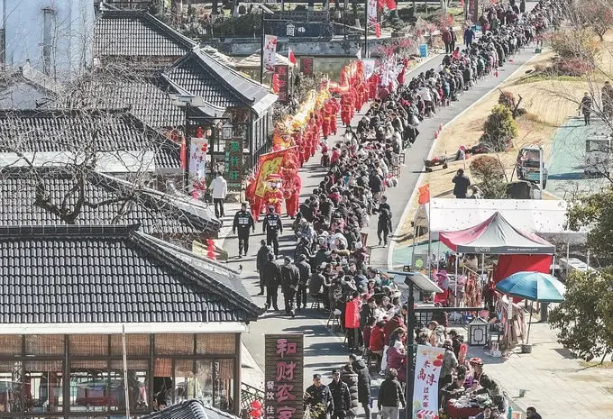 長(zhǎng)街宴不僅是味蕾的盛宴,更是一場(chǎng)傳統(tǒng)文化的嘉年華。與美食相伴的是氣勢(shì)如虹的舞龍隊(duì)、古樸熱鬧的中馬燈巡游、精彩的舞獅表演,在大山村,殺年豬的傳統(tǒng)儀式、虎虎生風(fēng)的少兒武術(shù)、靈動(dòng)活潑的小馬燈、喜慶昂揚(yáng)的舞蹈等節(jié)目輪番上演,生動(dòng)呈現(xiàn)了高淳非遺民俗的獨(dú)特魅力。