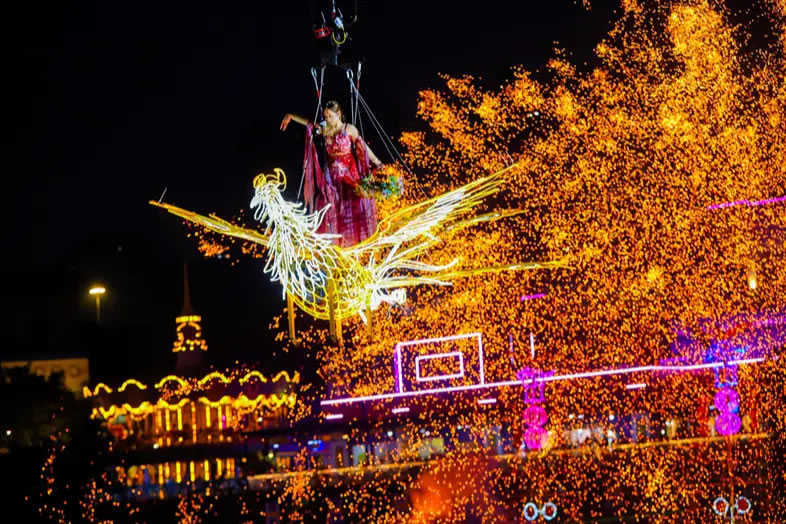 重慶歡樂(lè)谷舉行了新春大妙會(huì)活動(dòng),集水陸空立體非遺大秀、百場(chǎng)非遺演藝、多種民俗互動(dòng)、年味萬(wàn)福市集等于一體,以傳統(tǒng)與現(xiàn)代碰撞的獨(dú)特魅力為游客奉上沉浸式的地道年味體驗(yàn)。其中,非遺大秀在夜幕中璀璨亮相,1600℃的鐵水揮灑成漫天花火,演員化身“天女”撒下花瓣雨,湖面的龍船、火鳳凰、風(fēng)火輪等裝置火光綻放,光影成趣,水陸空一體聯(lián)動(dòng),驚艷絕倫;川劇變臉、潮汕英歌舞、福建游神、電音三太子等百場(chǎng)非遺演藝,讓游客可一站式領(lǐng)略全國(guó)傳統(tǒng)文化魅力,吸引絡(luò)繹不絕的游客前往。