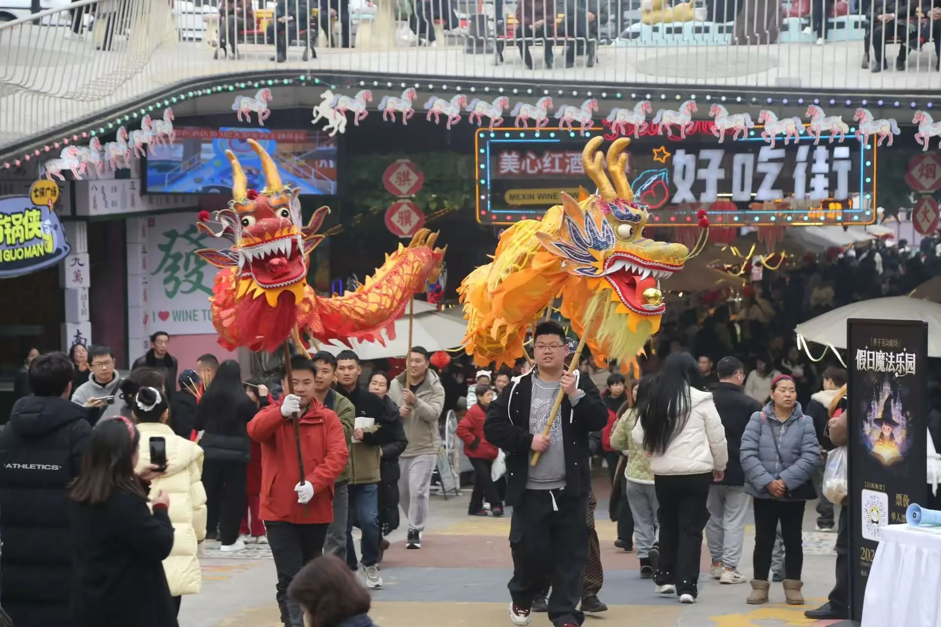 涪陵美心紅酒小鎮(zhèn)景區(qū)更是打破傳統(tǒng)景區(qū)“臺(tái)上表演、臺(tái)下觀看”的模式,全面轉(zhuǎn)向以游客為主導(dǎo),全民參與、沉浸式互動(dòng)的新春玩法,把游客真正“寵”進(jìn)濃濃年味里。除了舞龍舞獅、民俗巡游、財(cái)神送福等經(jīng)典項(xiàng)目外,游客還可以穿戲服、持龍具、跟著鼓點(diǎn)一起巡游,親身感受傳統(tǒng)年俗的熱鬧與儀式感,從“圍觀者”變身“參與者”,讓年味更足、歡樂(lè)加倍。15日至17日,景區(qū)人氣持續(xù)火爆,日均接待游客超6萬(wàn)人次,成為重慶近郊新春出游的熱門(mén)之選。
