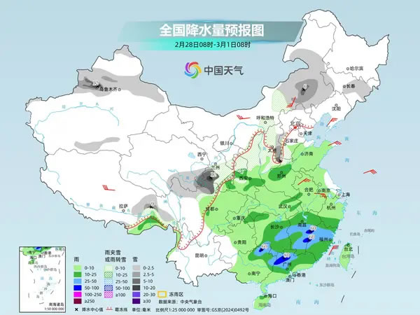 央視網(wǎng)消息:據(jù)中國天氣網(wǎng)消息,今天(2月27日),南方降雨范圍縮減,降雨重心南移至華南,部分地區(qū)有大雨。明后天,我國新一輪大范圍降水過程將接踵而至,江南、華南等地陰雨頻繁,需防范連續(xù)降雨對交通出行等方面的不利影響。受頻繁雨雪和冷空氣影響,未來幾天,北方氣溫多波動(dòng)起伏,華北、東北部分地區(qū)氣溫偏低,需注意保暖。
