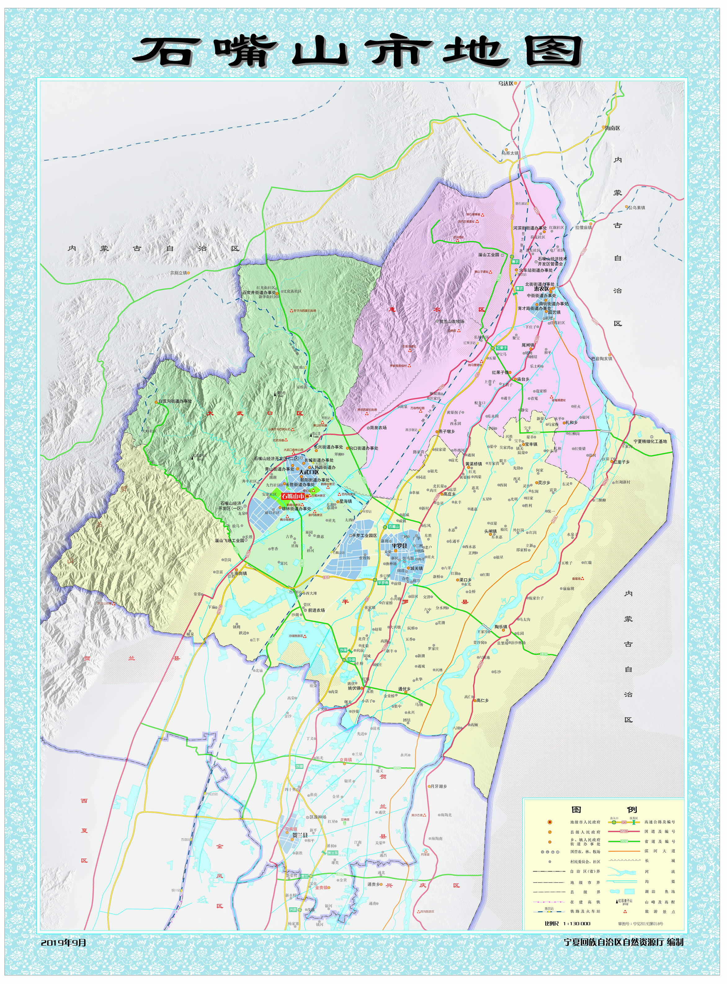 1975年11月23日,撤銷銀北地區(qū),恢復(fù)石嘴山市。石嘴山市因賀蘭山與黃河交匯處“山石突出如嘴”而得名,歷史悠久,秦朝時(shí)設(shè)渾懷障,西漢時(shí)設(shè)置第一個(gè)行政建制——廉縣,悠久歷史造就了厚重的文化底蘊(yùn),孕育了賀蘭山巖畫、古長(zhǎng)城、北武當(dāng)壽佛寺、平羅玉皇閣、田州塔等人文古跡,擁有移民文化、賀蘭山文化、工業(yè)文化等民宿文化;地理位置較為優(yōu)越,地處寧東、蒙西兩個(gè)國(guó)家千億噸級(jí)煤田之間,是呼包銀蘭經(jīng)濟(jì)帶、寧夏沿黃經(jīng)濟(jì)區(qū)、寧蒙陜?yōu)踅鹑墙?jīng)濟(jì)區(qū)的重要節(jié)點(diǎn)城市;距銀川河?xùn)|機(jī)場(chǎng)100千米,包蘭鐵路、京藏高速、烏瑪高速、109國(guó)道、110國(guó)道等貫穿全境,被列為國(guó)家公路運(yùn)輸樞紐城市、區(qū)域流通節(jié)點(diǎn)城市之一;黃河穿東過(guò),西依賀蘭山,湖泊星羅棋布。市境內(nèi)有5A級(jí)旅游景區(qū)沙湖、國(guó)家水利風(fēng)景區(qū)星海湖等風(fēng)景名勝。