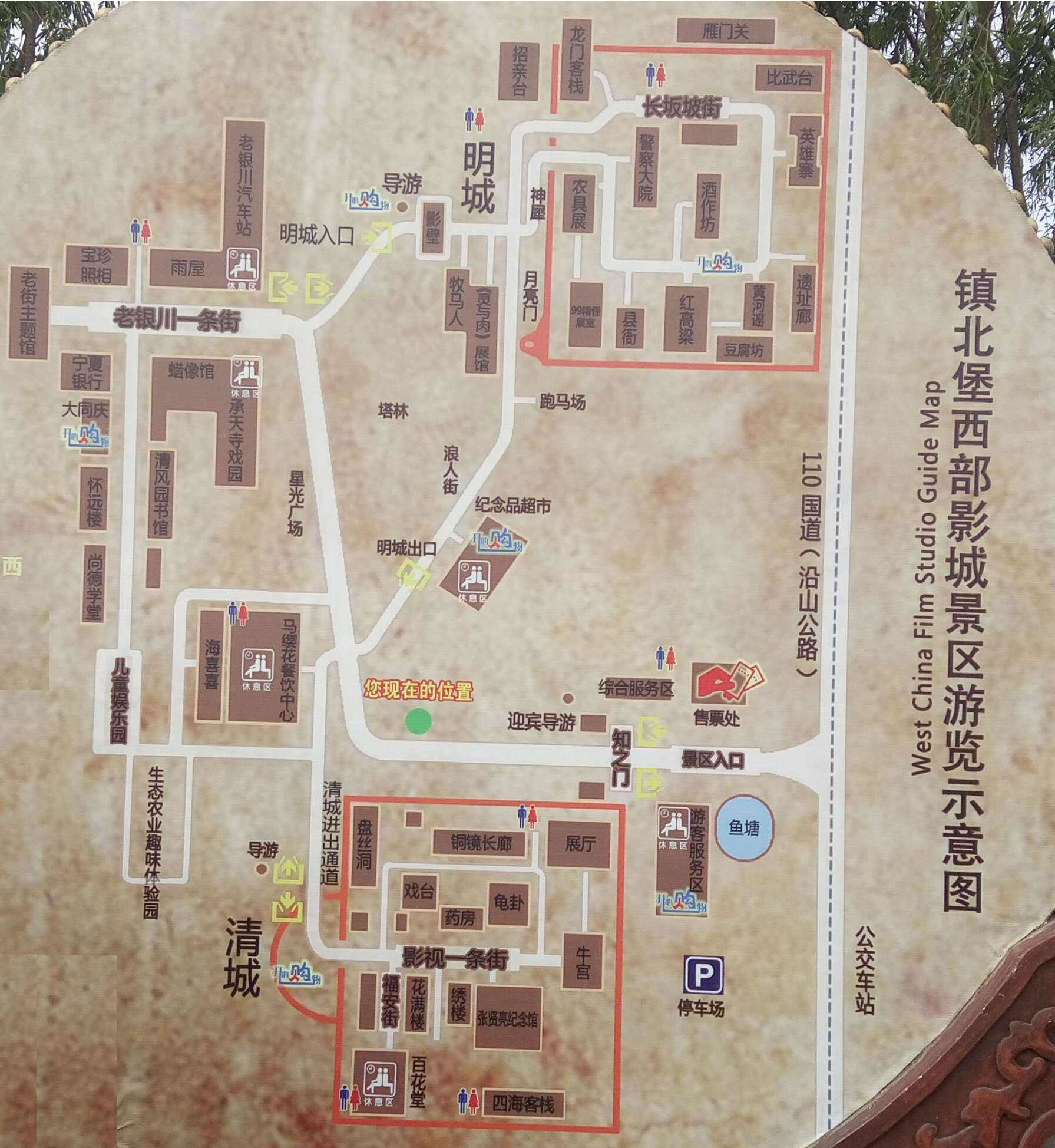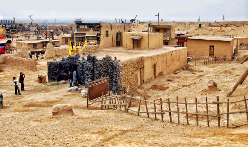 鎮(zhèn)北堡西部影城,位于寧夏回族自治區(qū)銀川市西夏區(qū)北端,占地面積0.7平方公里,建筑面積50萬平方米。鎮(zhèn)北堡西部影城有兩座古代城堡,兩堡一南一北,名為鎮(zhèn)北堡和鎮(zhèn)南堡,均坐西朝東。鎮(zhèn)北堡西部影城以古樸原始粗獷荒涼民間化為特色。鎮(zhèn)北堡西部影城內(nèi),保留和復(fù)原了拍攝過部分影片的場景和道具,供游人觀賞。展出的場景有《大話西游》中的城門樓和城門洞盤絲洞,孫悟空與牛魔王打斗時的“天崩地裂”等一系列場景!饵S河謠》中的“鐵匠營”實(shí)景!都t高粱》中的月亮門、釀酒作坊、九兒(鞏俐飾)居室和九兒出嫁時乘坐的轎子、盛酒的大缸碗具等。還建有電影資料館放映廳等影視服務(wù)設(shè)施。