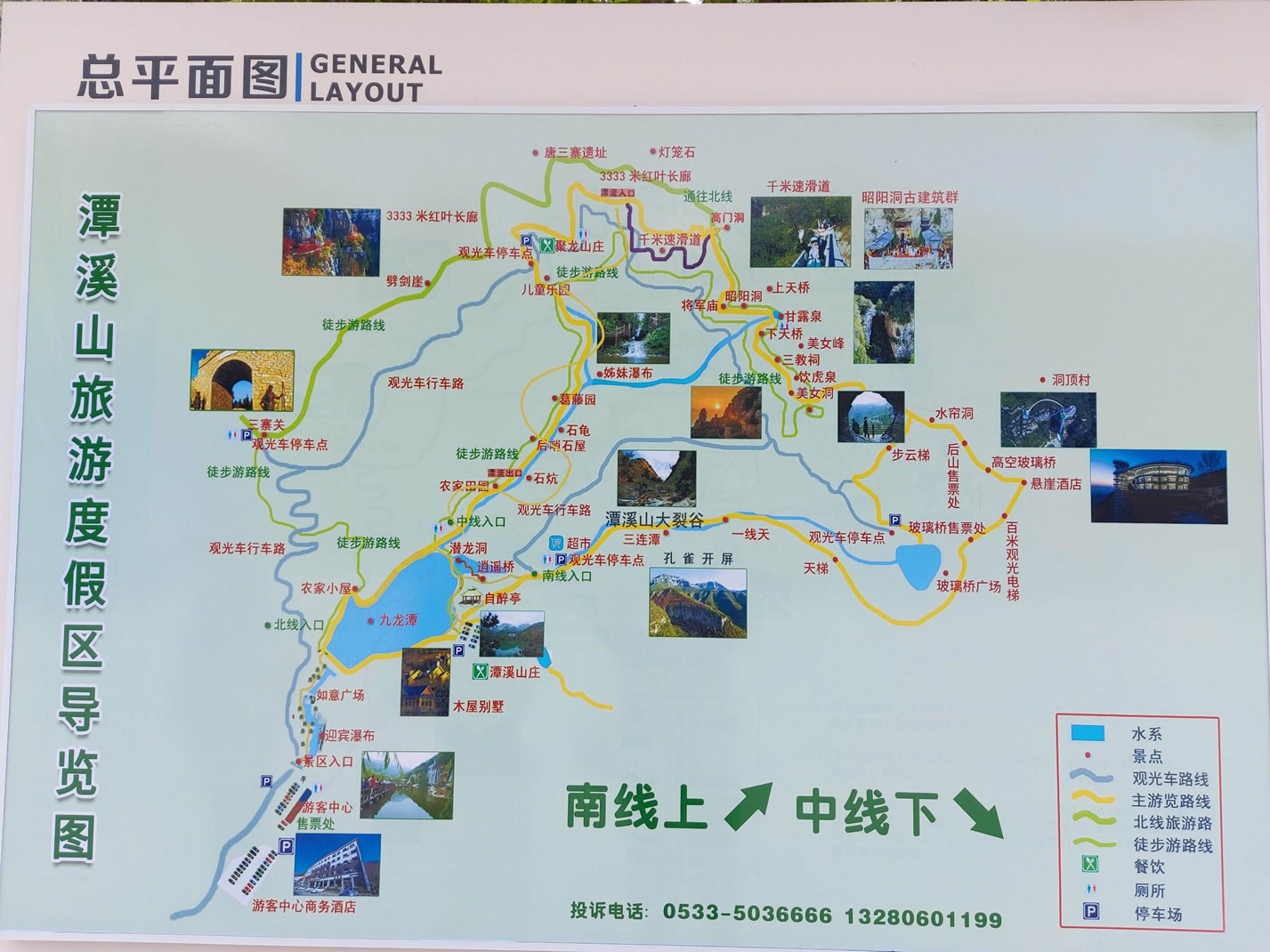 旅游南線:全程約3小時(shí),以山水景觀、奇石怪峽和豐富的人文景觀為特色,主要景點(diǎn)有: 潭溪山大瀑布、如意廣場(chǎng)、九龍?zhí)、自醉亭、潛龍洞、逍遙橋、石臼、石壩、滄桑石屋、孔雀開屏、潭溪山大裂谷、三連潭、太子石像、一線天、較量、兄弟瀑布、石祖(生命之根)、步云梯、王小洞、百米觀光電梯、高空玻璃橋、洞頂村、星洞傳說、水簾洞、龍鳳臺(tái)、美女峰、美女洞、九龍擁翠、飲虎泉、三教祠(昭陽南洞)、仙人橋(下天橋)、甘露泉、通天洞(生命之源)、上天橋、昭陽洞(昭陽洞北洞)、將軍祠、試劍峰、高門洞、千米速滑道、空中玻璃漂流、兒童樂園,乘坐觀光車或沿旅游中線步行下山。
