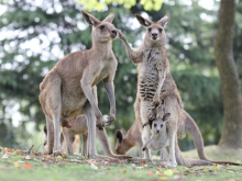 袋鼠是澳大利亞的國獸,有著獨(dú)特的育兒方式,袋鼠習(xí)慣用后肢跳躍前進(jìn),時速可達(dá)60公里。袋鼠坡草坪上的灰大袋鼠、赤大袋鼠組群生活,它們性格溫順。