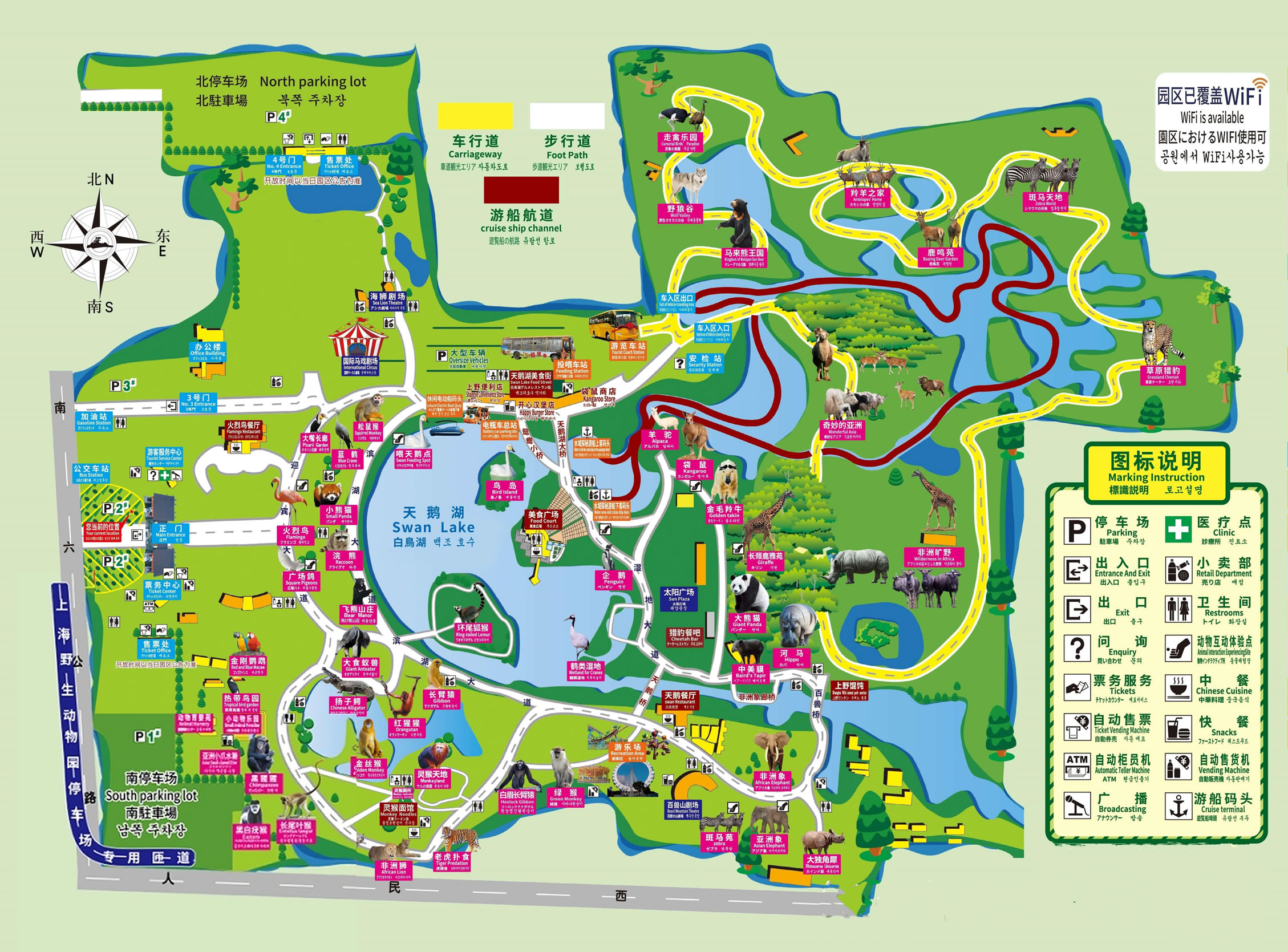上海野生動物園現(xiàn)有車入?yún)^(qū)、步行區(qū)兩大區(qū)域。車入?yún)^(qū)分布著奇妙的亞洲、非洲曠野、優(yōu)雅長頸鹿、最美閃電俠、草原霸主、荒野大力熊、森林之王、白虎領(lǐng)地、野狼谷、馬來熊王國10大主題區(qū)域。步行區(qū)則分布著大熊貓館、鶴類濕地、火烈鳥展區(qū)、企鵝館、天鵝湖、羊駝苑、紅猩猩館、中美貘館、小動物樂園、鸚鵡館、河馬館、白眉長臂猿展區(qū)、大食蟻獸展區(qū)、鱷魚島、狐猴島、浣熊展區(qū)、金絲猴島、飛熊山莊、綠猴區(qū)、白虎展區(qū)、松鼠猴、小熊貓區(qū)、黑猩猩館、袋鼠坡、長頸鹿雅苑、亞洲象展區(qū)、金毛羚牛館、國禮非洲獅展區(qū)、熱帶鳥園、斑馬苑、非洲象展區(qū)、老虎撲食區(qū)、白頰長臂猿島、藍(lán)鶴、大獨(dú)角犀、大嘴長廊、靈猴天地、亞洲小爪水獺展區(qū)、太陽廣場共39個館區(qū)。