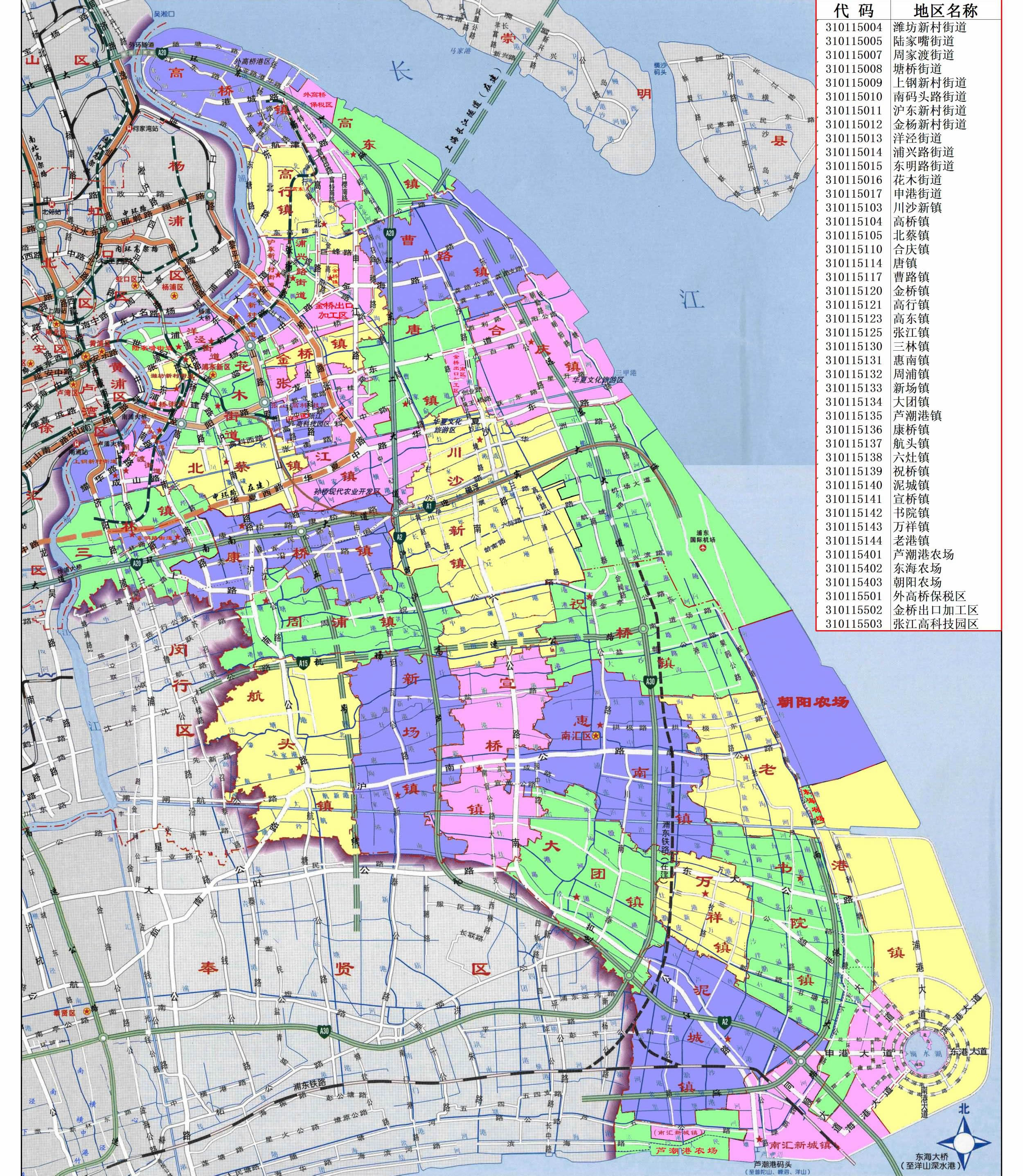 鎮(zhèn):川沙新鎮(zhèn)、高橋鎮(zhèn)、北蔡鎮(zhèn)、合慶鎮(zhèn)、唐鎮(zhèn)、曹路鎮(zhèn)、金橋鎮(zhèn)、高行鎮(zhèn)、高東鎮(zhèn)、張江鎮(zhèn)、三林鎮(zhèn)、惠南鎮(zhèn)、周浦鎮(zhèn)、新場鎮(zhèn)、大團鎮(zhèn)、康橋鎮(zhèn)、航頭鎮(zhèn)、祝橋鎮(zhèn)、泥城鎮(zhèn)、宣橋鎮(zhèn)、書院鎮(zhèn)、萬祥鎮(zhèn)、老港鎮(zhèn)、南匯新城鎮(zhèn)