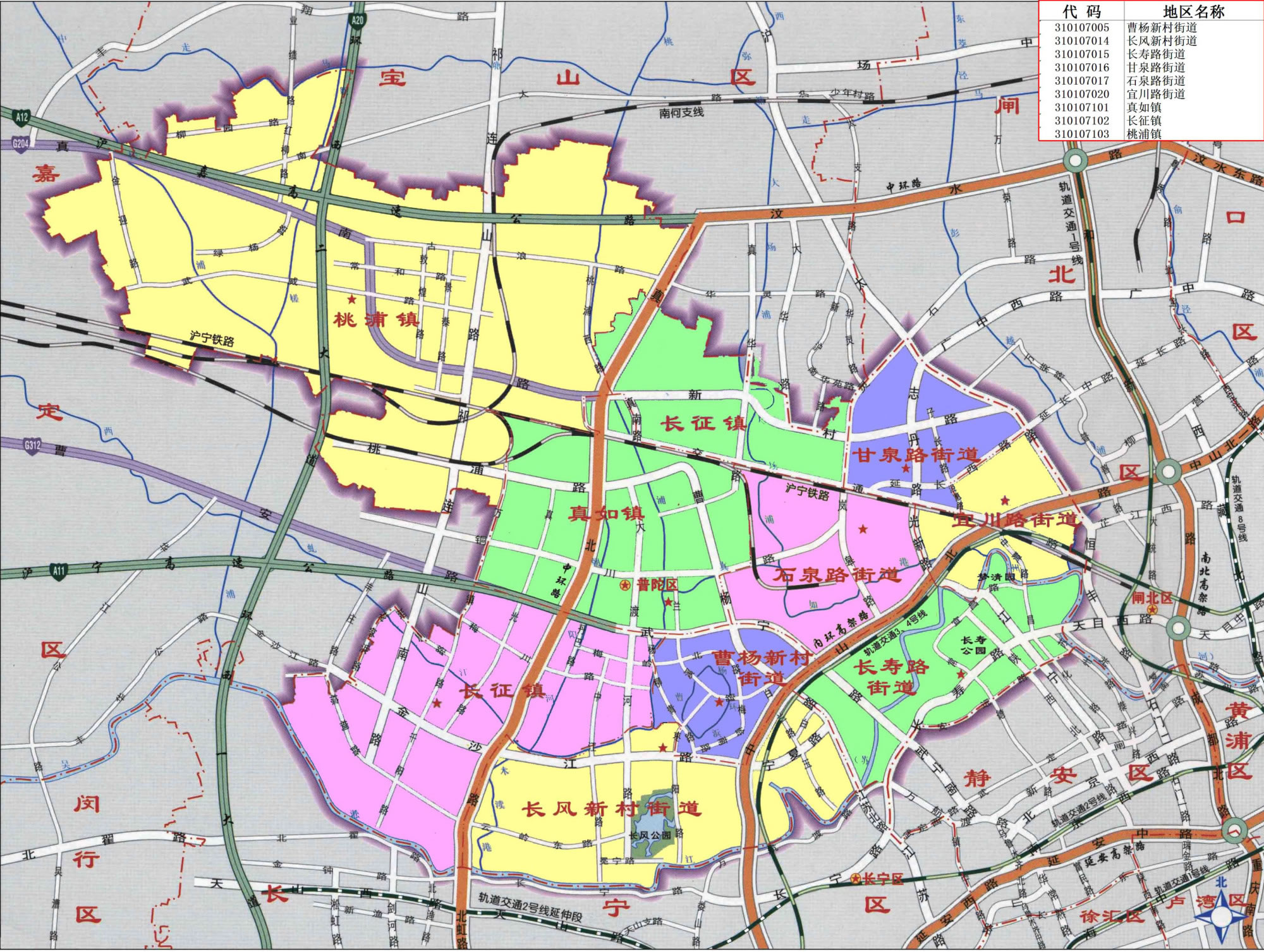 街道:曹楊新村街道、長(zhǎng)風(fēng)新村街道、長(zhǎng)壽路街道、甘泉路街道、石泉路街道、宜川路街道、萬里街道、真如鎮(zhèn)街道