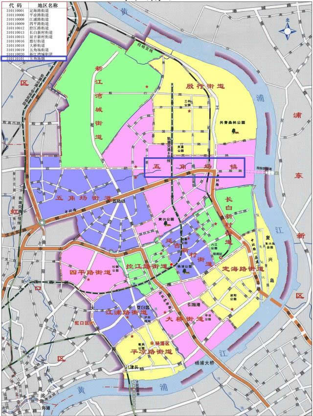 楊浦區(qū)轄12個(gè)街道:定海路街道、平?jīng)雎方值馈⒔致方值、四平路街道、控江路街道、長白新村街道、延吉新村街道、殷行街道、大橋街道、五角場街道、新江灣城街道、長海路街道
