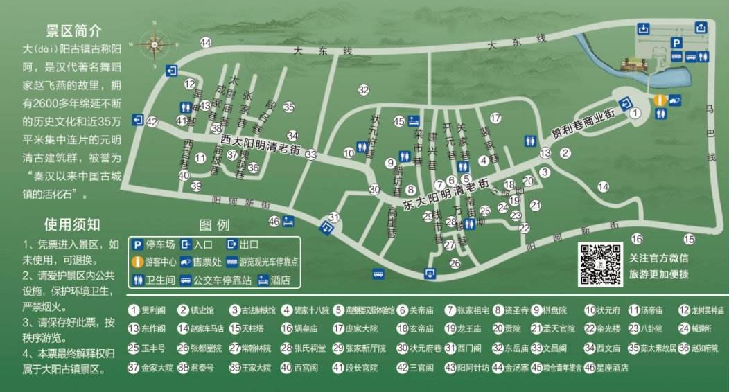 “東西兩大陽,南北四寨上,沿河十八莊,七十二條巷!边@是大陽曾經(jīng)繁華,曾經(jīng)輝煌,曾經(jīng)盛極一時(shí)的寫照于記憶是歲月長河大浪淘沙,長期積淀留給世人不可多得的文化珍寶。隨著手工制針業(yè)的衰落,大陽古鎮(zhèn)的商貿(mào)業(yè)也漸漸沒落。古鎮(zhèn)的繁華盛世遠(yuǎn)去,卻留下了規(guī)模宏大保存完好的明清古建筑群,大陽鎮(zhèn)因此被稱為“中國古城鎮(zhèn)活化石”。漫步古鎮(zhèn)中,城池寨堡、官宅商居、樓閣津梁、寺廟祠庵比比皆是,一磚一石、一草一木都散發(fā)出滄桑韻味,吸引著八方來客。