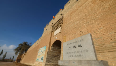 廣武古城分東、西、南三門(mén),不設(shè)北門(mén),街巷格局方正。坐落在山陰縣西南、雁門(mén)關(guān)外古長(zhǎng)城腳下。隸屬于山西省朔州市山陰縣張家莊鄉(xiāng)舊廣武村。