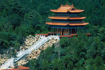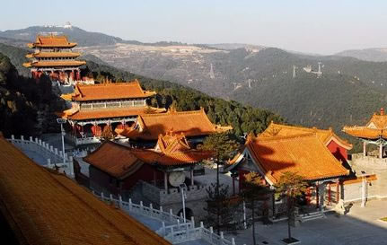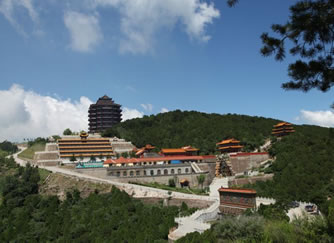 烏金山不僅有豐富的自然景致,而且還有數不盡的人文景觀。由于烏金山山高林密,氣候宜人,風景秀美,靜謐清幽,歷朝歷代多有僧侶入山修行,更有文人墨客、達官顯貴前來觀瞻,因此便留下了許多人文遺跡。這里是佛教圣地五臺山的下院,曾被稱為文殊菩薩講經的道場,于是便形成了以寺廟群落為主的諸多景觀。許多寺廟群都依山而建,金碧輝煌,氣勢恢弘。這些寺廟群大都分布在千頃碧綠的林海中。遠遠望去,就像茫茫綠海中時隱時現的海市蜃樓,顯得縹緲奇幻而又雄偉壯觀。