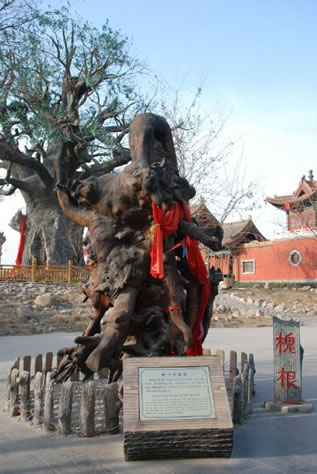 “根雕大門”是尋根祭祖園的正門,為槐根造型,東西跨度20米,高13米,其造型古老滄桑、偉岸厚重、支根入土、虬勁有力,寓意大槐樹后裔同門、同根、同祖、同心。象征大槐樹兒女舍小家,取大義,扎根神州大地,為國家繁榮、民族昌盛孜孜不倦地艱辛勞作和奮斗拼搏。詮釋的是移民后裔共同的根,共同的老家,是大槐樹兒女的魂。