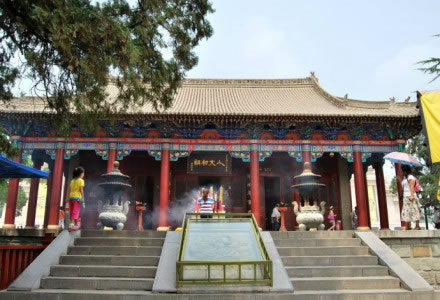 沿中軸線北行即到誠心亭,原稱過亭,面闊五間,進深一間,面積約85平方米。歇山頂上,灰布板瓦與筒瓦緊緊相扣,前檐施勾頭滴水,四邊無墻,欄額下為花格裝飾,旋子彩繪。明間南北兩側(cè)臺基石砌如意踏步,次間、補間外側(cè)有圍欄圍護。亭柱上書有兩幅楹聯(lián):“觀天地生物氣象,讀古今經(jīng)世文章”;“誠朝圣地人文祖,心祭神州兒女情”。