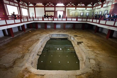 御湯遺跡:1982年4月,華清池內(nèi)基建時,在今“貴妃池”西側(cè)發(fā)現(xiàn)了古建筑基址,省文管會考古隊即開始發(fā)掘考證。用了3年多時間發(fā)掘了約4000平方米的面積,發(fā)現(xiàn)了一條長18米、寬5.1米的唐代蛇形水源通道和4座青石砌成的浴池,還有大殿基址4處,發(fā)現(xiàn)30多米長的石墻和兩處蓮花踏步,總長400多米的陶管水道,長50米的磚砌水道及建筑材料多件。1983年7月,考古工作者在溫泉總源北部發(fā)掘出一個東西長10.6米,南北寬6米,深1.5米。輪廓呈蓮花瓣形的浴池遺址,池底及四周均用青石鋪砌,池內(nèi)有兩層臺,池底南有兩個圓形水口。專家根據(jù)史籍記載華清宮的御池方位、形制、規(guī)模和發(fā)現(xiàn)的浴池四周的大殿基址和柱礎(chǔ)等,認為是唐玄宗使用的九龍殿蓮花湯。1984年10月在緊挨蓮花湯西北處,發(fā)掘出一個保存完好的海棠花形狀的浴池,東西長3.6米,南北寬2.9米,深1.26米,用青石砌成,池內(nèi)有二層臺階,池底正中有一圓形水口,做工考究,雕刻精細,專家認為是“海棠湯”,即唐玄宗御賜楊玉環(huán)的“貴妃池”。在蓮花湯西南還發(fā)掘出一個東西長5米,南北寬2.7米,深1.2米,用青石鋪砌的長方形浴池。據(jù)文獻記載推測,應是“太子湯”。經(jīng)考證,這些古建筑遺存與史志書記載完全吻合,是一組較完整的唐華清宮建筑遺址,也是華清宮的中樞所在,為唐玄宗和貴妃游幸時活動的主要場所。期已經(jīng)全面整理,并仿唐形制,建成“唐華清宮御湯遺址博物館”供游人參觀。