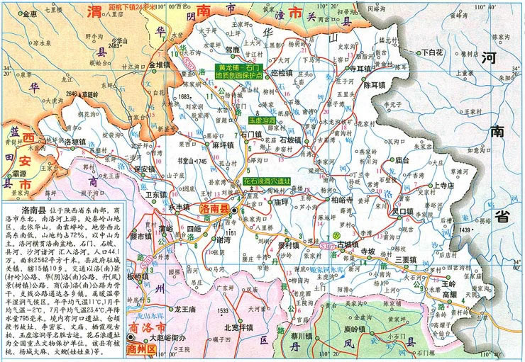 洛南縣位于秦嶺東段南麓,洛河上游。介于北緯33°52′00″—34°25′58″、東經(jīng)109°44′10″—110°40′06″之間。北縣城與相鄰縣距離為:西經(jīng)葡萄嶺距商州市區(qū)72公里,西南經(jīng)胡河妗子溝距商洛市區(qū)市區(qū)45公里,南經(jīng)楊洞距丹鳳縣城71公里,北經(jīng)黑彰距潼關(guān)縣城72公里,東南經(jīng)箭桿嶺距河南省盧氏縣城135公里,西距西安市155公里,東北經(jīng)河南道距首都北京1200公里、經(jīng)山西道距北京1100公里。素有“陜西東南門戶”之稱。今縣政府位于城關(guān)鎮(zhèn)。