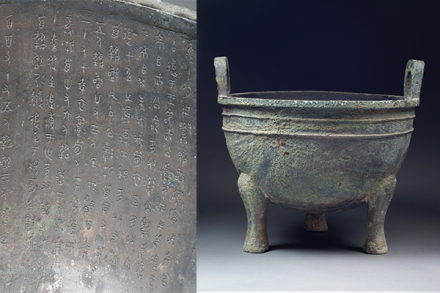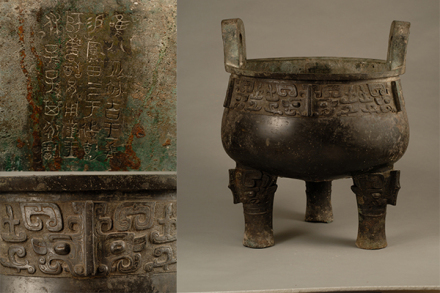 鑄于周康王時(shí)期,造型敦厚雄偉,紋飾莊重神奇。通高77厘米,口徑56.5厘米。立耳,深腹,平沿方唇,三柱足。口沿下飾浮雕狀饕餮紋,地襯細(xì)雷紋。三足根部飾大饕餮面。雙耳外側(cè)各飾一條曲體上緣的夔龍。腹外壁及底部厚積煙跡,顯系長(zhǎng)期使用所致。腹內(nèi)壁鑄有銘文28字。旟鼎承襲商代圓鼎風(fēng)格,造型厚重莊嚴(yán),紋飾十分精美,所刻銘文是研究周初土地制度的重要史料,具有珍貴的歷史及藝術(shù)價(jià)值,加之鑄刻時(shí)代明確,被公認(rèn)為周康王時(shí)的標(biāo)準(zhǔn)器,是一尊著名的西周時(shí)期的國(guó)寶。