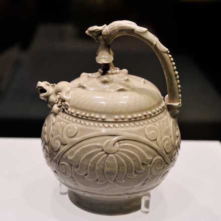 這件提梁倒灌壺是著名的耀州窯(窯址在今陜西省銅川市王益區(qū)黃堡鎮(zhèn))產(chǎn)品。耀州窯是唐宋時(shí)中國(guó)北方名窯,時(shí)人推崇耀瓷“巧如范金,精比琢玉”。此壺造型古樸典雅,制作規(guī)整精細(xì),紋紋繁褥華麗,尤其是構(gòu)思奇特,設(shè)計(jì)巧奪天工,被認(rèn)為是國(guó)內(nèi)外存世耀州窯瓷器中最為精美的一件。