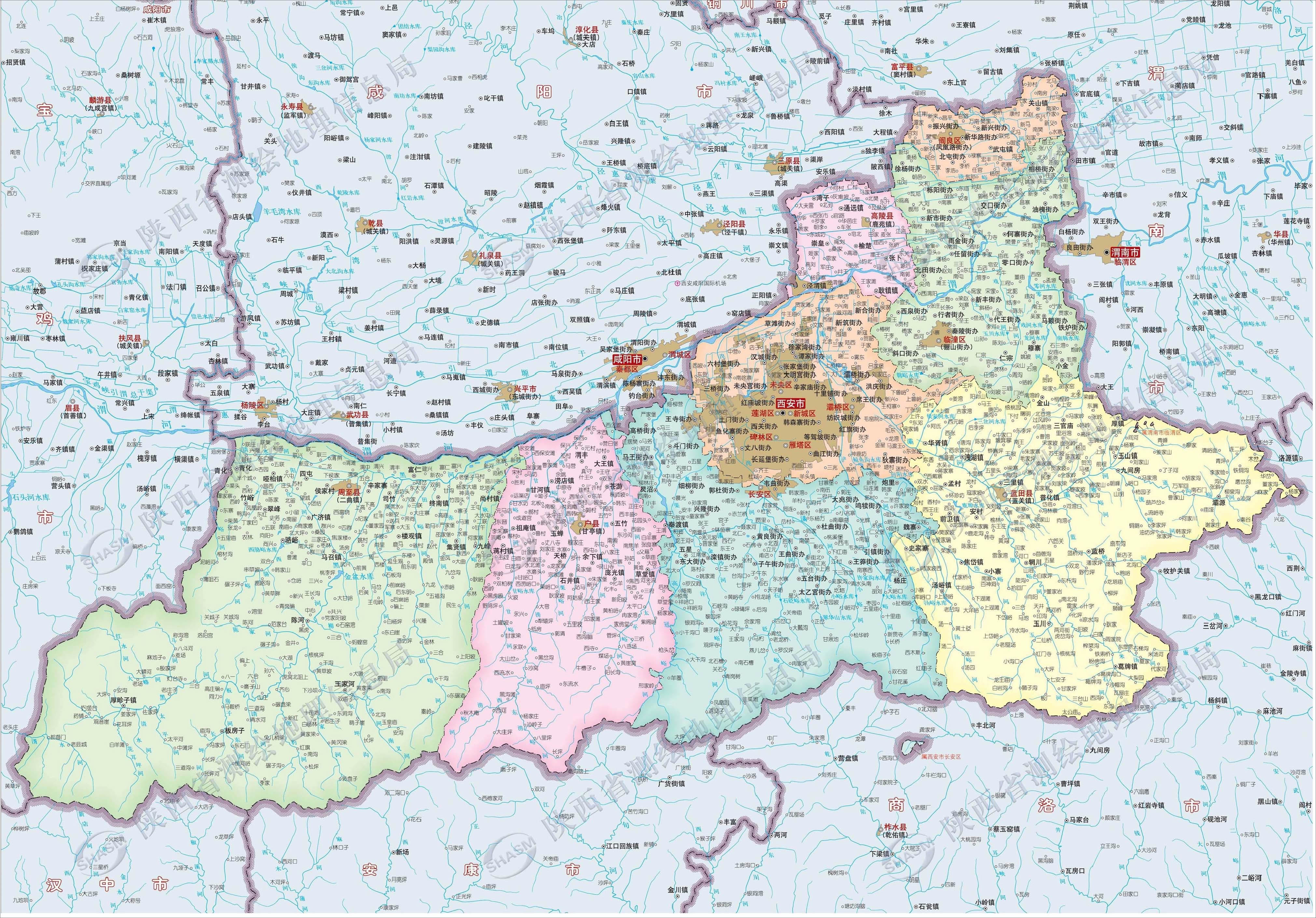 西安市位于黃河流域中部關(guān)中盆地,北臨渭河和黃土高原,南鄰秦嶺。東以零河和灞源山地為界,與渭南市華州區(qū)、商洛市商州區(qū)、洛南縣相接;西以太白山地及青化黃土臺塬為界,與眉縣、太白縣接壤;南至北秦嶺主脊,與佛坪縣、寧陜縣、柞水縣分界;北至渭河,東北跨渭河,與咸陽市區(qū)、楊凌區(qū)和三原、涇陽、興平、武功、扶風(fēng)、富平等縣(市)相鄰。轄境東西長約204千米,南北寬約116千米,總面積10108平方千米。
