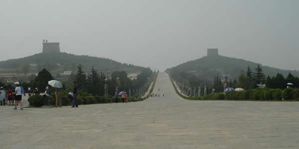 此景距縣城6公里,與乾陵渾然一體,乾陵朱雀門(mén)南面從兩乳峰之間通向獻(xiàn)殿的御道兩側(cè),豎有華表,石馬(翼馬)、駝馬、翁仲、述圣紀(jì)碑、無(wú)字碑、石獅、六十一賓王等大型精細(xì)石雕,120多尊依次排列。石馬在前,雙翅高振,凌空欲飛,栩栩如生,其他石雕左右配置,緊隨其后,魁梧奇?zhèn),氣象萬(wàn)千,被史學(xué)界譽(yù)為“唐代露天石雕藝術(shù)博物館”。近年來(lái),國(guó)家文物旅游局又投巨資,對(duì)34尊石雕扶直加固,對(duì)御道鋪石美化,使此景更加恢宏壯觀。