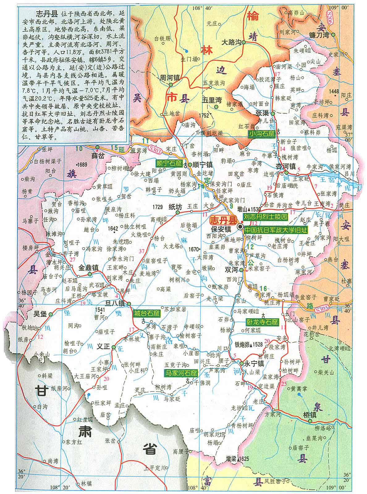 志丹縣位于延安市西北部,是“群眾領(lǐng)袖、民族英雄”劉志丹將軍的故鄉(xiāng),被譽為中國革命的“紅都”。全縣總土地面積3781平方公里,轄6鎮(zhèn)5鄉(xiāng)土91個行政村。全縣總?cè)丝?3.4萬人,其中農(nóng)業(yè)人口10.6萬人,人口密度為35.4人/平方公里。全縣平均海拔1093-1741米,年平均氣溫7.8℃,年平均降水520毫米,多集中在7、8、9三個月,無霜期142天。