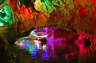 由南天門往右,沿著崎嶇的“盤陀路”進(jìn)入第二殿,隨著“一柱廳”、“半天山”到達(dá)約有450平方米寬的“東海龍宮”那里“定海神針”直立,“五彩神泉池”水色清澈晶瑩,不寒而栗有“白龍?jiān)浇瓓Z寶”、“頑猴望”、“海獅戲蓮”、“別甲神鷹鎮(zhèn)金沙”、“龍王百寶箱”等天然造型,氣勢(shì)磅礴,極為壯觀。龍宮內(nèi)洞中有洞、景中有景。“武陵園”有牛角尖、簸箕天,海螺洞中有“鶴蚌相爭(zhēng)”、“海螺觀戰(zhàn)”、“鳴鑼助戰(zhàn)”、“石床”等石筍、鐘乳石造型,相映成趣,目不暇接。然而,“山有洞天不算奇,陰河劃船數(shù)第一”。沿著灣灣曲曲的跳蹬路,耳聽潺水聲,觀看“地海橫鯨”、“青蛙駝蓮”、“天地桃”、“美猴照鏡”等景點(diǎn)來(lái)到陰河劃船處——“凱旋門”、只見幽幽碧水,微泛漣漪,各種燈光倒映水中的燈景冉冉浮動(dòng)。