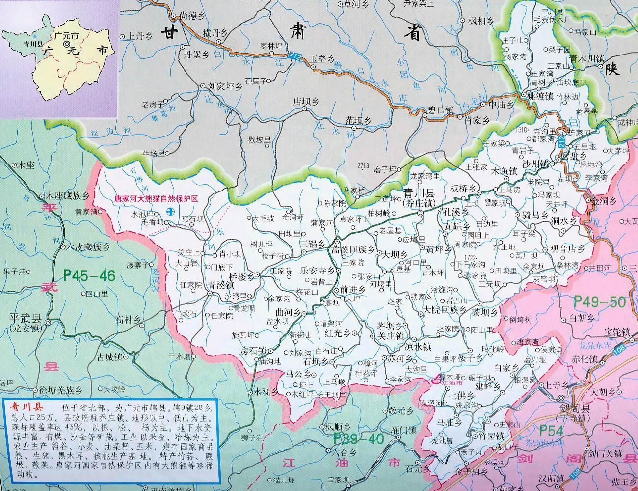 青川縣轄9個(gè)鎮(zhèn)、25個(gè)鄉(xiāng)、2個(gè)民族鄉(xiāng)、1個(gè)國家級自然保護(hù)區(qū):