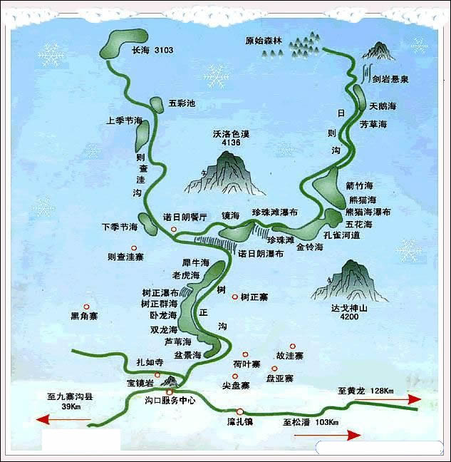 九寨溝國家級自然保護(hù)區(qū)內(nèi)有108個(gè)高山湖泊,它們大部分成群分布,面積大小不同,小的半畝,大的千畝以上。九寨溝有許多天池,其中最大的長達(dá)7千米,天池的四周覆蓋著郁郁蔥蔥的原始森林。九寨溝大型瀑布有17處,為九寨溝諾日朗瀑布。保護(hù)區(qū)內(nèi)最大的湖泊為長海子,它由此向南達(dá)7千米。