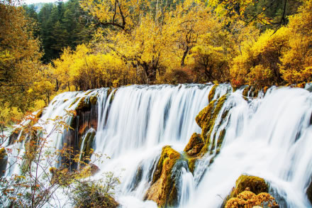 諾日朗瀑布海拔2343米,高24.5米、寬320米,是中國最寬的高山鈣華瀑布。滔滔流水自諾日朗群海而來,從瀑頂樹叢中傾瀉而下,像數(shù)條潔白的哈達(dá),水勢浩大,聲震山谷。寒冬時(shí)節(jié),瀑布成了一幅巨大的冰幔,無數(shù)的冰柱懸掛在陡崖之上,成為罕見的冰晶世界,造型各異的冰雕迎光透著幽幽的藍(lán)色魅惑,是九寨溝六絕之一“藍(lán)冰”。