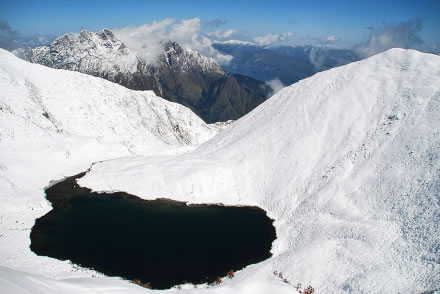 黑湖(黑海)藏名措拉,面積約5畝,深8米,這是相當(dāng)深、相當(dāng)?shù)湫偷囊粋(gè)冰斗湖遺跡。據(jù)資料所述,早年當(dāng)?shù)夭孛裉旌登笥陼竭@個(gè)湖,湖上常年飄有低云,在下面大聲呼喊,上面的云就會落下雨滴。夏天的黑湖附近是一片草場,冬日雪景又是另外一番景觀。