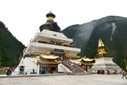 目前,九寨溝景區(qū)僅保留了樹正寨、荷葉寨、則查洼寨這三個(gè)村寨,善良淳樸的他們,用微笑迎接著前來九寨溝的每一個(gè)人。而在這些村寨中,最壯觀的莫過于樹正寨前的“九寶蓮花菩提塔”,七彩經(jīng)幡隨風(fēng)飄蕩,圣潔的白塔在陽光下仿若閃著光,這里也是眾多游客到來時(shí),都會雙手合十,輕聲祭拜的地方。