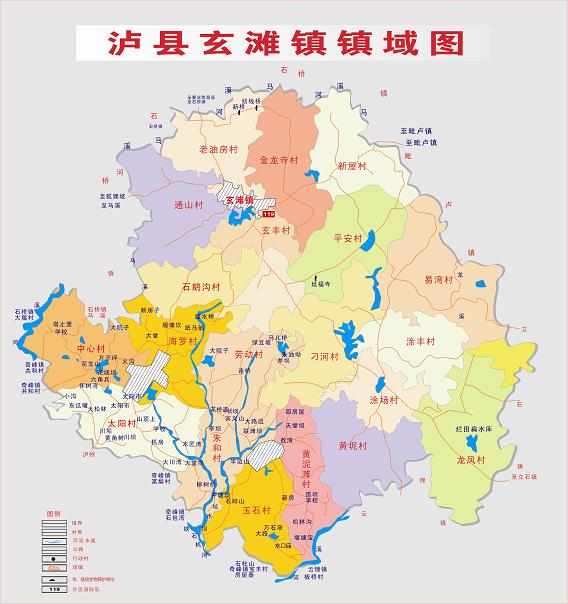 瀘縣玄灘鎮(zhèn)鎮(zhèn)域圖 行政區(qū)劃 瀘縣玄灘鎮(zhèn)幅員面積115平方公里,轄區(qū)內(nèi)人口9萬人,城鎮(zhèn)建成區(qū)面積2平方公里,常住人口2.2萬人。轄5個(gè)社區(qū)、20個(gè)行政村《正大街社區(qū)、東街社區(qū)、西街社區(qū)、中和社區(qū)、喻坪社區(qū) 》、《石鵝溝村、金龍寺村老油房村、通山村、石鵝溝村、玄豐村、新屋村、平安村、刁河村、黃坭村、涂場村、龍鳳村、涂豐村、易灣村 、太陽村、中心村、海羅村、玉石村、黃泥灘村、勞動(dòng)村、朱和村》! 歷史沿革 1934年設(shè)玄灘鎮(zhèn),1937年改鄉(xiāng),1951年復(fù)建鎮(zhèn),1958年改公社,1992年再復(fù)鎮(zhèn)。1997年,面積74平方千米,人口5.6萬,轄龍鳳、飛躍、永紅、涂鋒、刁河、馮光、黃泥、同豐、黃林、新山、平安、光前、紅星、向?yàn)场⒁诪、斷石龍、新屋、蔣灣、金龍寺、新房子、玄鋒、高場、陳家咀、石鵝溝、通山、萬居所、桑壩、東風(fēng)、宋糟坊、瓦子壩、清油坊31個(gè)行政村和正大街、馬路街、半邊街、鹽聯(lián)街4個(gè)居委會(huì)。 2004年,面積78平方千米,轄31個(gè)村、4個(gè)社區(qū),總?cè)丝?7621人。集鎮(zhèn)建成區(qū)面積1.7平方千米,常住人口2.15萬人。 2006年,將原玉河鎮(zhèn)所屬行政區(qū)域并入玄灘鎮(zhèn)。玄灘鎮(zhèn)政府駐玄灘場。