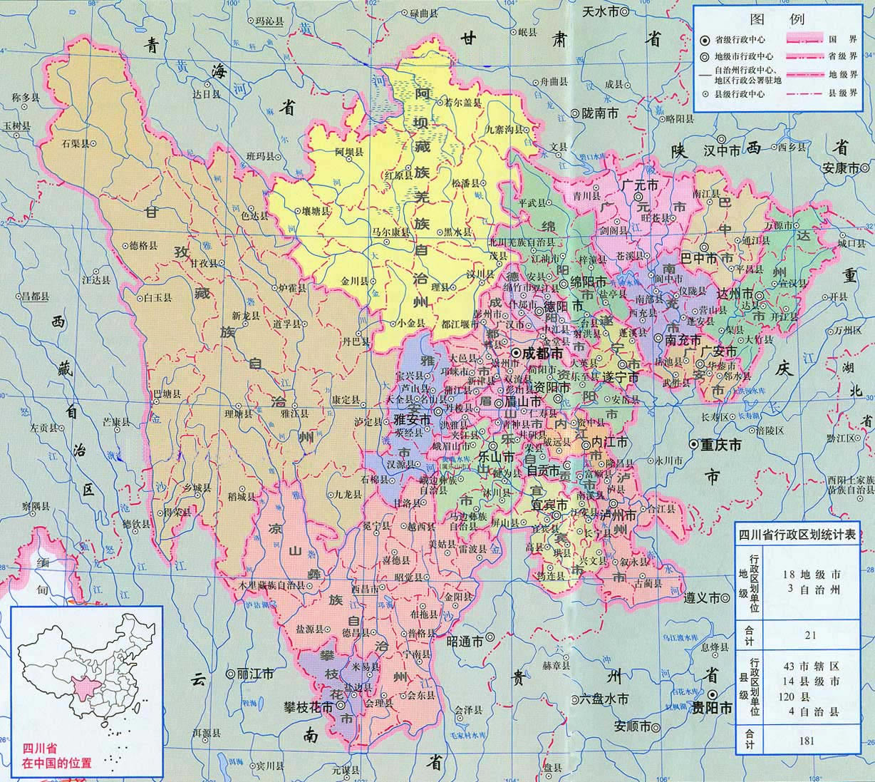 行政區(qū)劃:四川的行政區(qū)劃共有21個市、地、州, 轄177個縣(市、區(qū)), 其中有13個地級市、5個地區(qū), 3個自治州, 18個縣級市, 35個市轄區(qū), 124個縣, 3個自治縣。