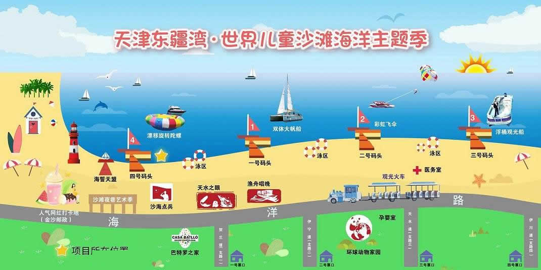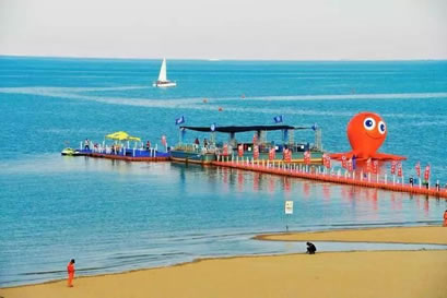 景區(qū)還將增添激情水上飛碟、快艇漂移、水上沙發(fā)、水上UU船、帆船、海上滑梯、海上蹺蹺板等數(shù)十項(xiàng)大型游樂設(shè)施,讓這里真正成為海上“迪士尼”。作為配套設(shè)施,在人工海灘西側(cè)修建濱海路,全長1.3公里,道路寬24米,為景區(qū)內(nèi)步行觀景道路,道路兩側(cè)綠化面積約6700平方米。綠化廣場總面積12萬平方米,景區(qū)停車場總面積約4700平方米。景區(qū)設(shè)置為沙灘親水區(qū)、沙灘游泳休閑區(qū)、水上運(yùn)動(dòng)休閑中心和水上休閑娛樂區(qū)。其中,位于沙灘游泳休閑區(qū)已經(jīng)建成的海景會所,是目前國內(nèi)北方最大的單體木結(jié)構(gòu)海景酒店會所,設(shè)有餐飲、住宿、淋浴、商務(wù)、娛樂等設(shè)施,并提供有地道的天津狗不理包子。另外,會所周邊正在建設(shè)游艇會所、五星級酒店、運(yùn)動(dòng)廣場、低密度住宅、高爾夫球場等設(shè)施。配套服務(wù)設(shè)施將逐步完善。