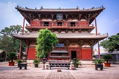 山門前兩稍間是兩尊遼代彩色泥塑金剛力士像,俗稱“哼”“哈”二將,后兩稍間是清代繪制的“四大天王”彩色壁畫。山門梁柱粗壯,斗拱雄碩,“升起”和“側(cè)腳”明顯。據(jù)說山門的牌匾乃嚴嵩所題。