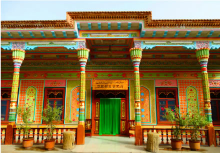 這座民族特色濃郁,極具刀郎人建筑風(fēng)格的宴藝廳就是刀郎部落招待貴賓及聚會、就餐、欣賞刀郎歌舞的場所。餐廳裝飾工藝主要為刀郎人傳統(tǒng)的石膏雕、木雕和磚雕。墻面上色彩艷麗,植物花卉圖案的是石膏雕,回廊上的木柱子為木雕,據(jù)說這樣的一根柱子需要兩個工匠花一個月時(shí)間才可完成。屋檐最上面一層為磚雕。刀郎部落宴藝廳可容納300人就餐,在品嘗地道刀郎美味的同時(shí)還可欣賞刀郎歌舞表演。