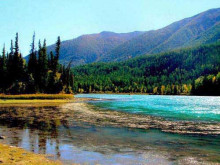 駝頸灣位于喀納斯湖南面一公里位置,是喀納斯湖的入水口,位于喀納斯河發(fā)源地?{斯河在這里形成了一個恰似駝頸的大拐彎?{斯河在此形成“之”字形的大拐彎,由南東轉(zhuǎn)向南西,后又轉(zhuǎn)向東。河流彎急谷深,水流湍急。在第一拐彎的起始處有一梭形的河心洲,第二拐彎處形成急流灘。河?xùn)|岸為草甸,河西岸為原始森林。
