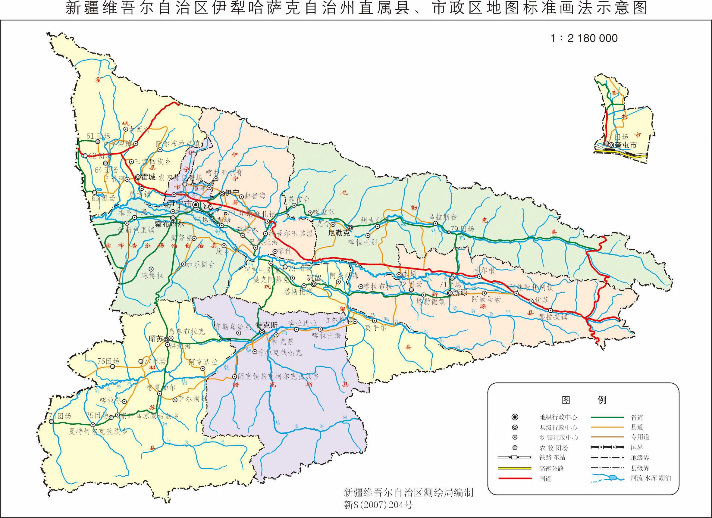 霍爾果斯市 面積1908.55平方千米,人口65227,政府駐隴海路3號(hào),下轄4個(gè)街道、1個(gè)鄉(xiāng)