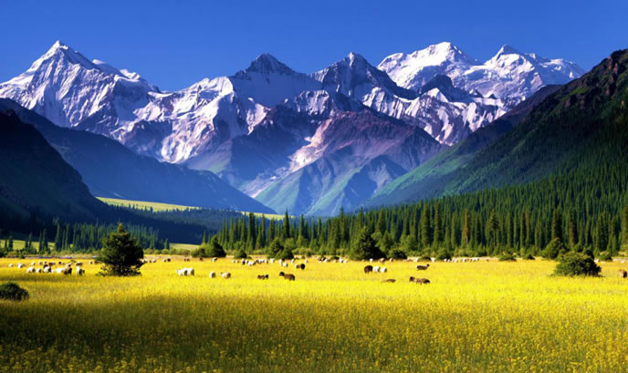 地形地貌 昭蘇縣為中亞內(nèi)陸腹地一個(gè)群山環(huán)抱的高位山間盆地,由于四周高山環(huán)抱,形成了一個(gè)較為獨(dú)特的自然生態(tài)環(huán)境,海拔在1323米-6995米之間。南部為天山主脈,山勢(shì)雄偉,高峻綿亙,是阻擋南疆沙漠干熱風(fēng)的天然屏障;北部為烏孫山,呈東西走向,山體較矮;西部受沙爾套山以及哈薩克斯坦境內(nèi)查旦爾山的阻隔,形成一個(gè)南、西、北三面高,東部略低的盆地。山地、丘陵與平原之比為4∶1。號(hào)稱(chēng)“天山之父”的汗騰格里峰,位于西南部的中哈邊境線(xiàn)上,海拔6995米,是天山山脈第二大高峰,終年積雪區(qū)達(dá)100平方公里以上,是特克斯河的主要水源。是新疆境內(nèi)唯一一個(gè)沒(méi)有荒漠的縣。