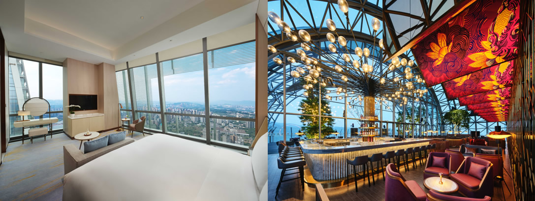 重慶來福士洲際酒店由建筑大師摩西·薩夫迪設(shè)計(jì),以“朝天揚(yáng)帆”為靈感,坐落于城市地標(biāo)建筑群,俯瞰長(zhǎng)江與嘉陵江交匯景致。酒店380間豪華客房通過“水晶連廊”與42層大堂相連,并設(shè)251米高空景觀露臺(tái)與奢華餐飲,帶來全方位難忘體驗(yàn)。餐飲亮點(diǎn)包括耍·高空露臺(tái)餐廳酒吧,透明漂浮露臺(tái)可一覽兩江交匯與城市美景。酒店約2,000平米的會(huì)議空間采用落地玻璃設(shè)計(jì),將自然景致引入室內(nèi),營(yíng)造開闊通透的活動(dòng)場(chǎng)景。酒店整體空間融入巴渝文化元素,在現(xiàn)代設(shè)計(jì)中彰顯人文底蘊(yùn)與城市魅力。