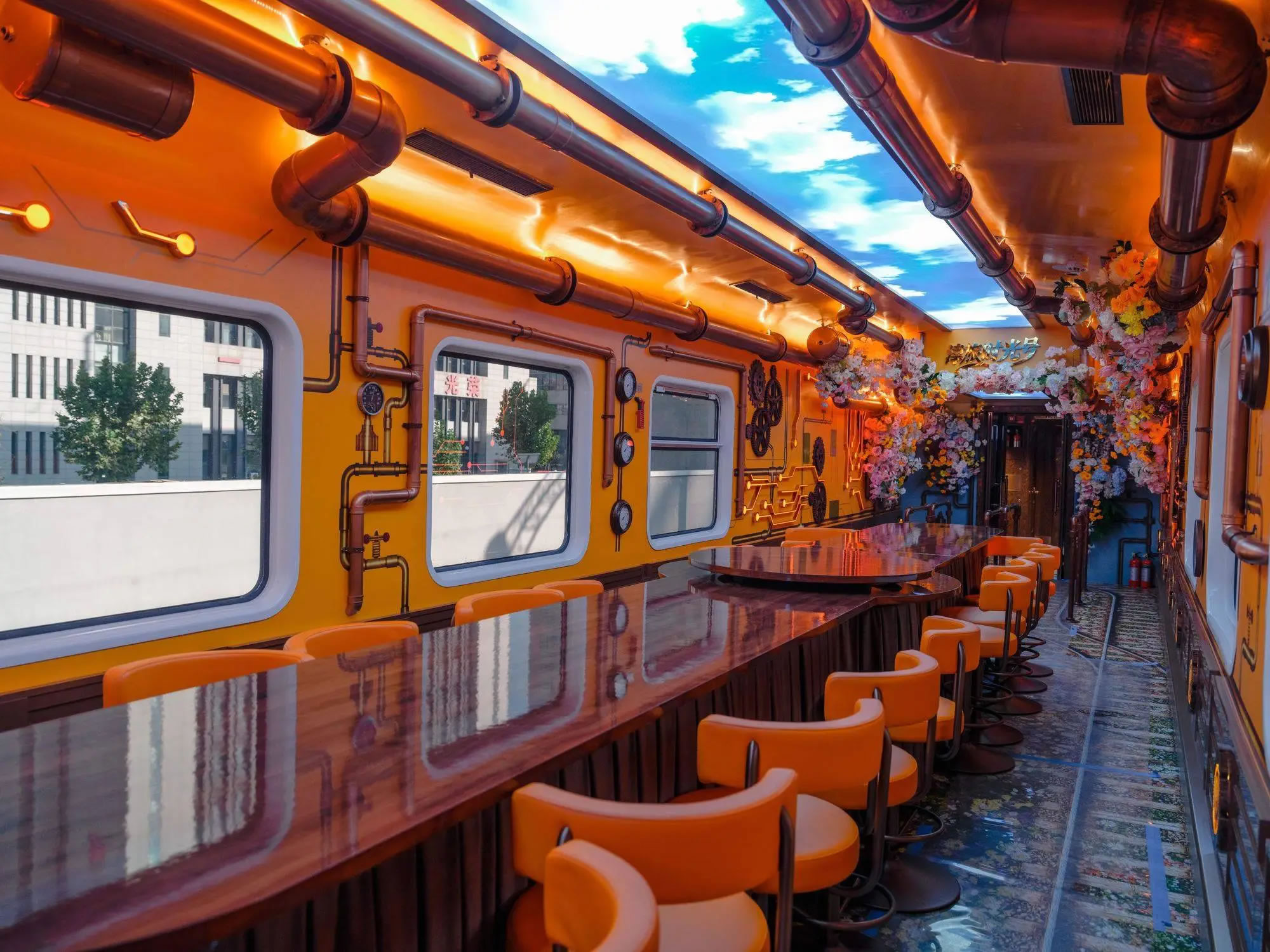 列車共設(shè)10節(jié)主題鮮明的特色車廂:分別為復(fù)古客座車廂、蒙太奇幻境互動演藝車廂、珍奇花園俱樂部車廂、沉浸式時空穿梭機(jī)車廂以及專屬VIP車廂,均以沉浸式戲劇化空間為理念,將座椅拆分重組,每節(jié)車廂形成互動或演藝區(qū),配備移動舞臺、隱藏?zé)糗壓铜h(huán)繞音響。座椅、地面及軟裝材料兼顧安全與舒適,同時配備冷暖氣系統(tǒng)、移動吧臺和多功能儲物柜,提供全方位的互動體驗(yàn)。