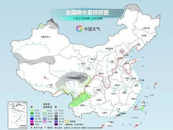 今明天,受弱冷空氣影響,新疆北部、甘肅西部一帶雨雪逐漸增多。特別是明天,也就是小雪節(jié)氣第一天,新疆、甘肅等地雨雪范圍廣,新疆北部沿天山一帶還將出現(xiàn)大到暴雪。同時(shí),青海南部、西藏東北部、四川西北部一帶也將有降雪。