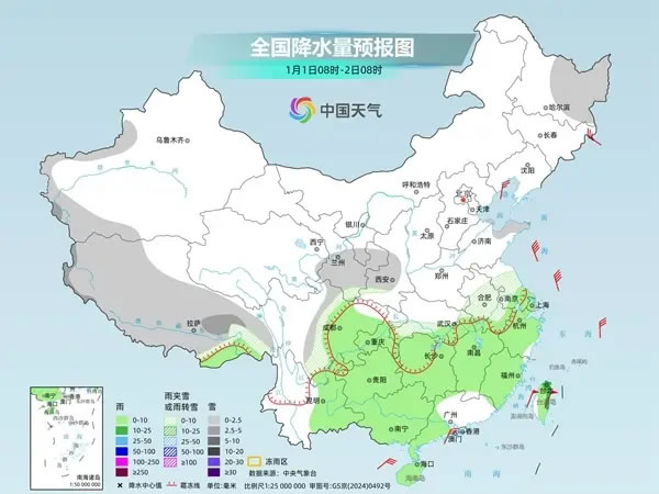 除了降溫,冷空氣還將帶來大范圍雨雪天氣。隨著冷空氣南下與暖濕氣流交匯,今天至2026年1月1日,中東部將現(xiàn)大范圍雨雪,陜西中南部、山西南部、河南西部、湖北西部部分高海拔地區(qū)有大雪或暴雪,最強降雪時段為2025年12月31日至2026年1月1日早晨。