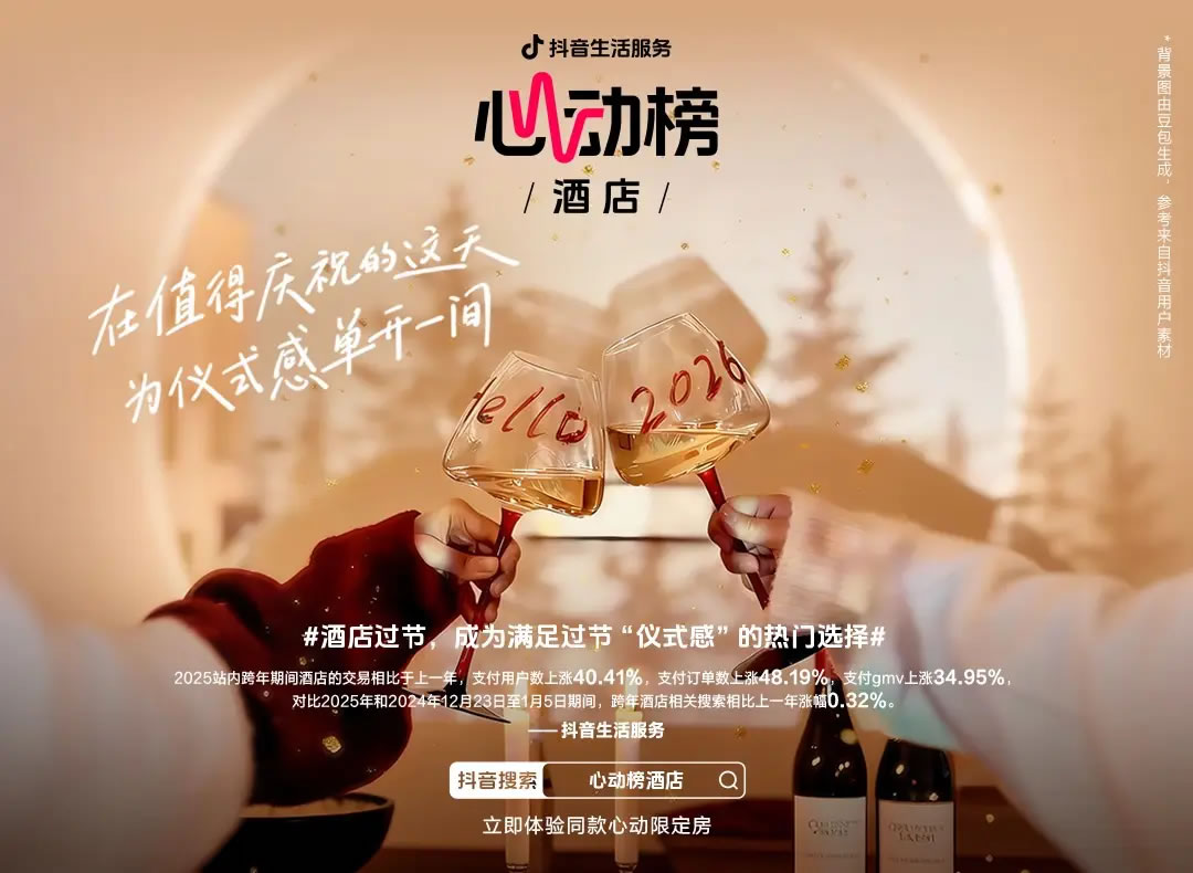 在這場(chǎng)全民性儀式感浪潮中,抖音生活服務(wù)推出的「心動(dòng)榜酒店」之跨年航班和紅人派對(duì),精準(zhǔn)切入并引爆了市場(chǎng)熱度,數(shù)據(jù)顯示,圍繞此類活動(dòng)的內(nèi)容播放量和參與度屢創(chuàng)新高。酒旅行業(yè)的競(jìng)爭邏輯,正在從傳統(tǒng)的“目的地與價(jià)格”之爭,全面升級(jí)為 “場(chǎng)景營造與情緒共鳴”, 抖音正試圖重塑高端酒店的消費(fèi)體驗(yàn),并重新定義節(jié)假旅行的消費(fèi)決策路徑。