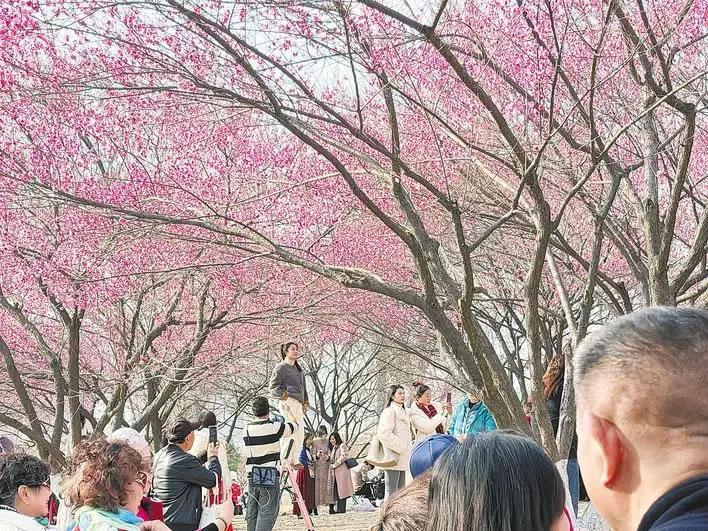 雖是工作日午后,坡上已有數(shù)百位市民游客漫步賞玩;ㄓ叭顺敝校藢3潭鴣淼臄z影愛好者架起“長(zhǎng)槍短炮”,更有許多家庭扶老攜幼,在梅林間游玩、野餐。曾是約拍行業(yè)淡季的隆冬時(shí)節(jié),也成了旺季。“花期比往年早了近一個(gè)月,好幾個(gè)周末的‘約拍’都排滿了。”攝影愛好者周女士邊調(diào)整鏡頭邊說。據(jù)攝影師“四葉草”介紹,周末這里人流如織,即便今天是工作日,前來拍照的游客依然不少。“目前‘梅花坡’花開得最盛,大家都搶著來出片,競(jìng)爭(zhēng)壓力不小。眼下的梅花是開年第一波熱度。”