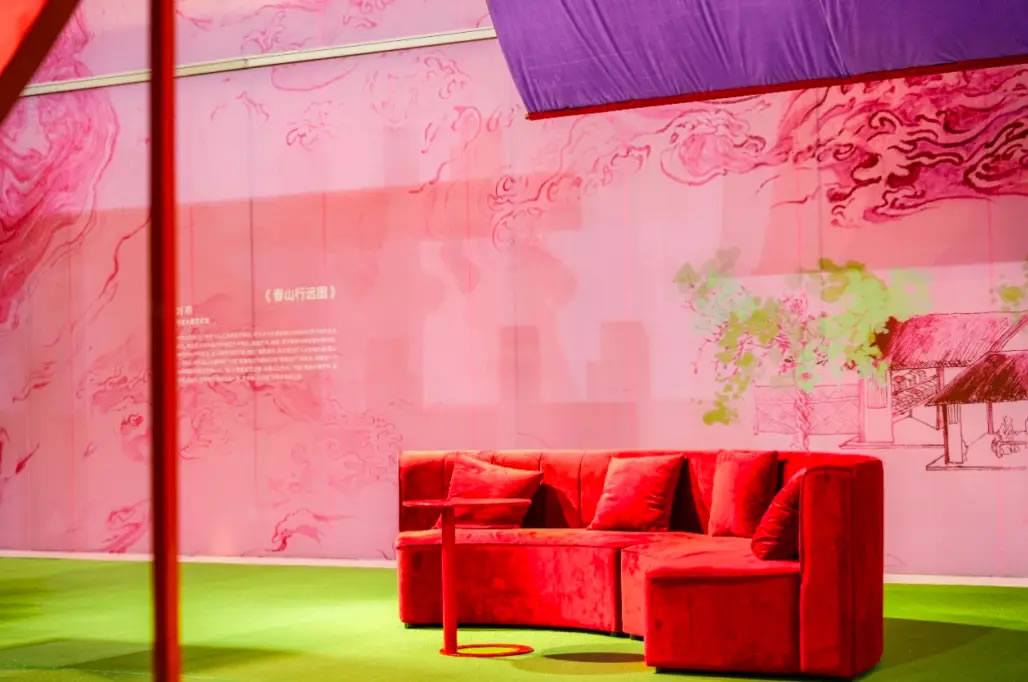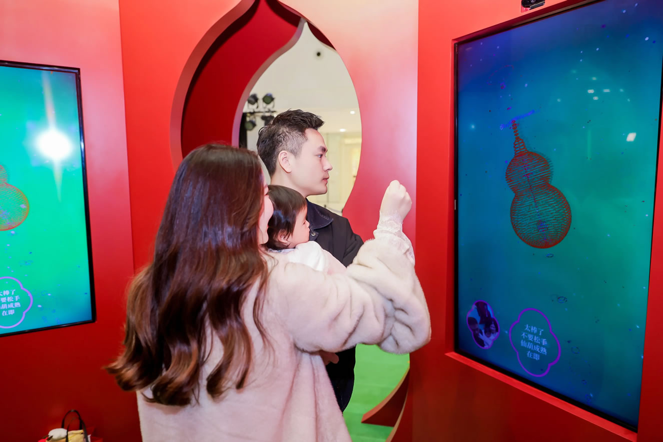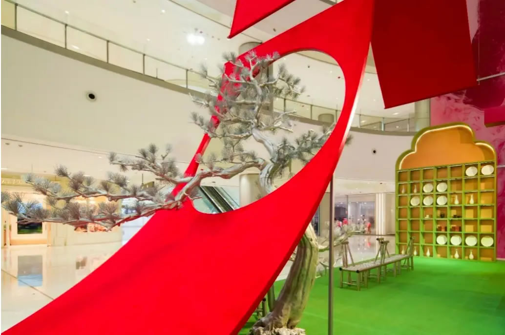 山水,并非遠行才可得見。書法水墨藝術家劉玥首展作品《春山行遠圖》以20米巨幅“山水開卷”,步入其中,與天地春意從容照面;紅色的帷幔落于銀色的松枝上,就像于山間松下靜謐的一隅,“幕下棲心”將是絕佳開年時尚大片的打卡處;松下銀椅,為你與摯友“漫敘往來”的相聚時刻營造出寧靜、松弛的氛圍;多寶閣中陳列著未經(jīng)雕琢的茶器素胚與場內品牌萬仟堂,長沙尼依格羅酒店及tea'stone帶來的新春茶器,以“初芒蘊能”詮釋著未來的無限可能與新生力量。轉身與“蒔光種愿” 四方亭相遇。葫蘆門朝四方而開,寓意著納四方福祿,步入其中,與數(shù)字交互藝術家吳旭首展作品《無限福祿》體驗互動,跟隨指引揮動手勢,觸發(fā)粒子凝聚為動態(tài)“福”字,親手完成一場新春祈福儀式。我們把象征團圓與喜悅的紅色沙發(fā)打造“盞間聚暖”,如懷抱般圍合的布局作為“歸處”的隱喻。與家人團聚便是心歸處,這將是中國年最圓滿的意象。