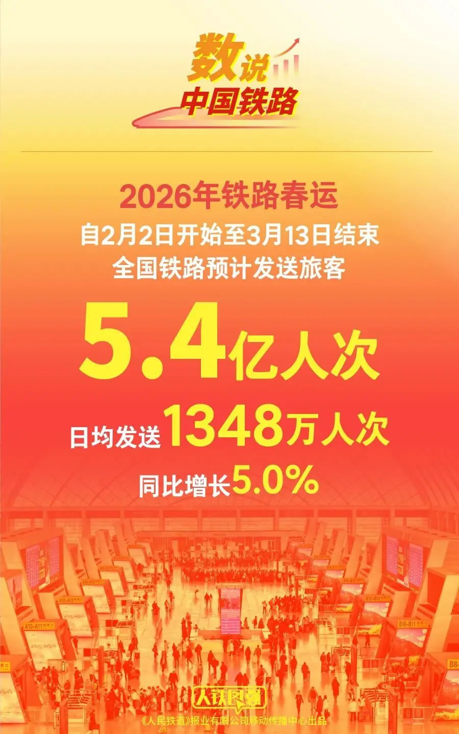 2026年鐵路春運(yùn)今日啟動(dòng),自2月2日至3月13日結(jié)束,為期40天,全國(guó)鐵路預(yù)計(jì)發(fā)送旅客5.4億人次,日均發(fā)送1348萬(wàn)人次、同比增長(zhǎng)5.0%。