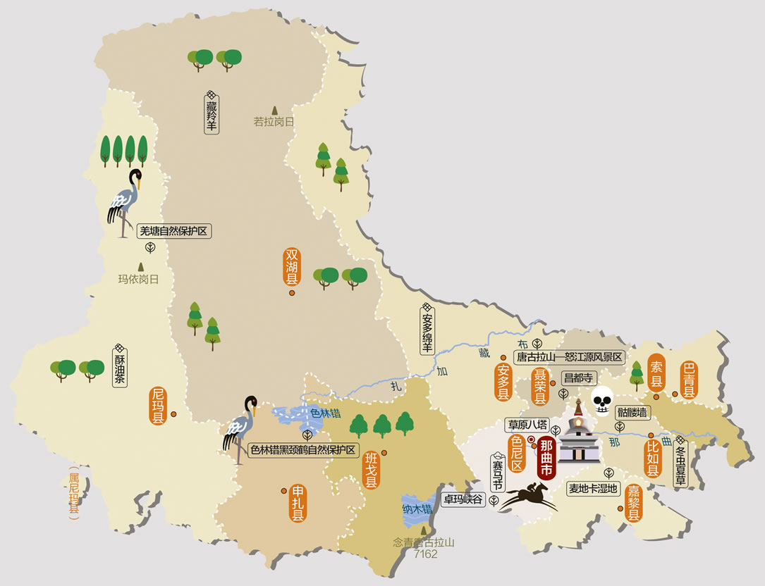 色尼區(qū) 面積16195平方千米,人口104490,政府駐那曲鎮(zhèn),下轄3個鎮(zhèn)、9個鄉(xiāng)