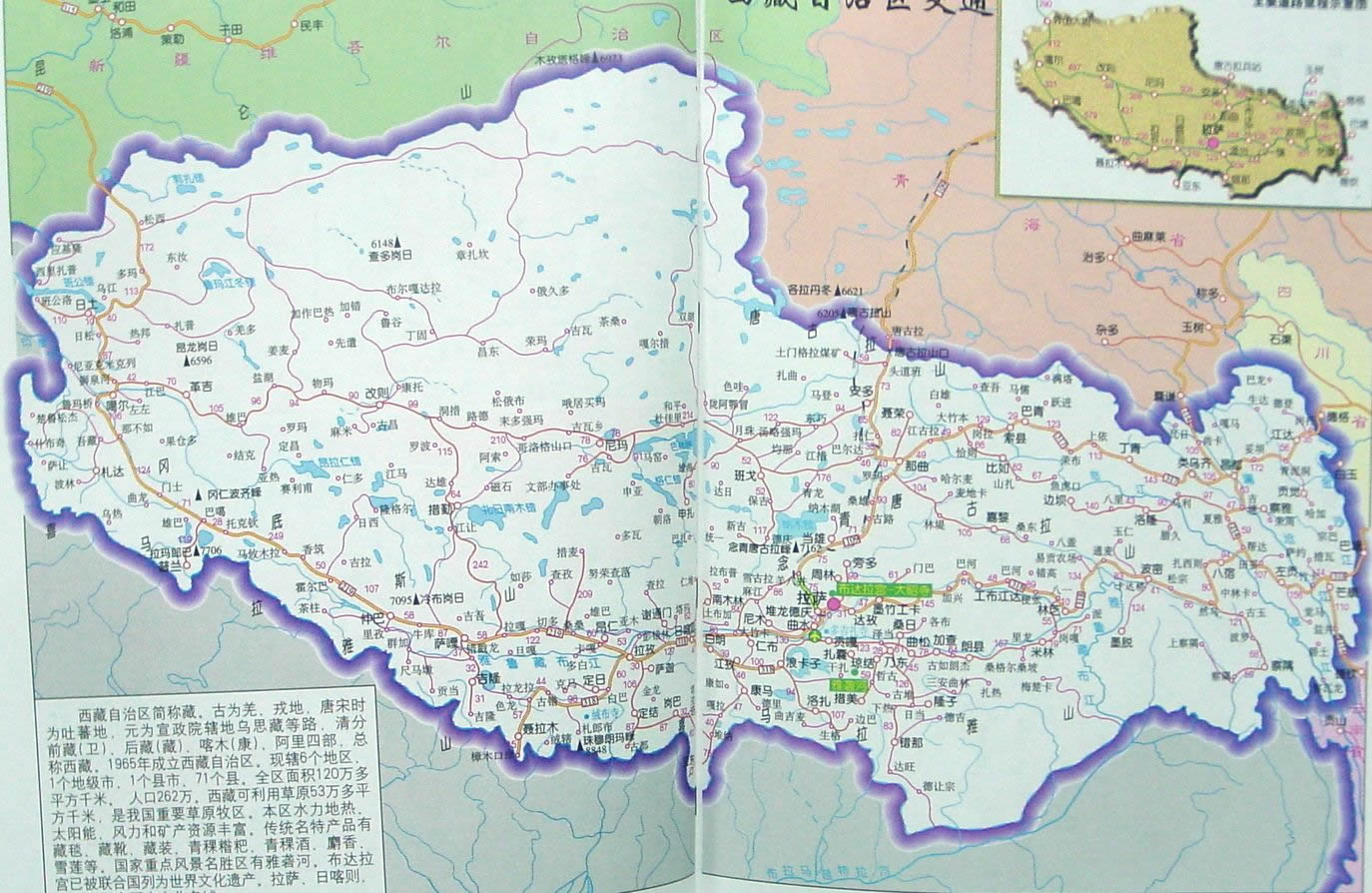 西藏自治區(qū),簡稱藏。西藏位于中華人民共和國的西南邊陲,青藏高原的西南部,東經(jīng) 78°25′至99°06′,北緯26°44′至36°32′之間。面積一百二十多萬平方公里,占全國的1/8,平均海拔4000米以上,是有“世界屋脊”之稱的青藏高原的主體部分。它北臨新疆,東北連接青海,東面與四川相連,東南與云南相鄰,南邊和西部與緬甸、印度、不丹、錫金、尼泊爾接壤,邊境線近四千公里,是我國與南亞次大陸聯(lián)系的紐帶。其間,綿亙著眾多巨大的山脈,奔流著無數(shù)湍急的流,高原湖泊星羅棋布,林海莽莽,濤聲萬里。西藏的行政區(qū)劃分為1個地級市、6個地區(qū),下轄1個縣級市,70個縣,1個縣,1個縣級區(qū),2個縣級辦事處, 899個鄉(xiāng),31個鎮(zhèn)。自治區(qū)首府設(shè)在拉薩市。