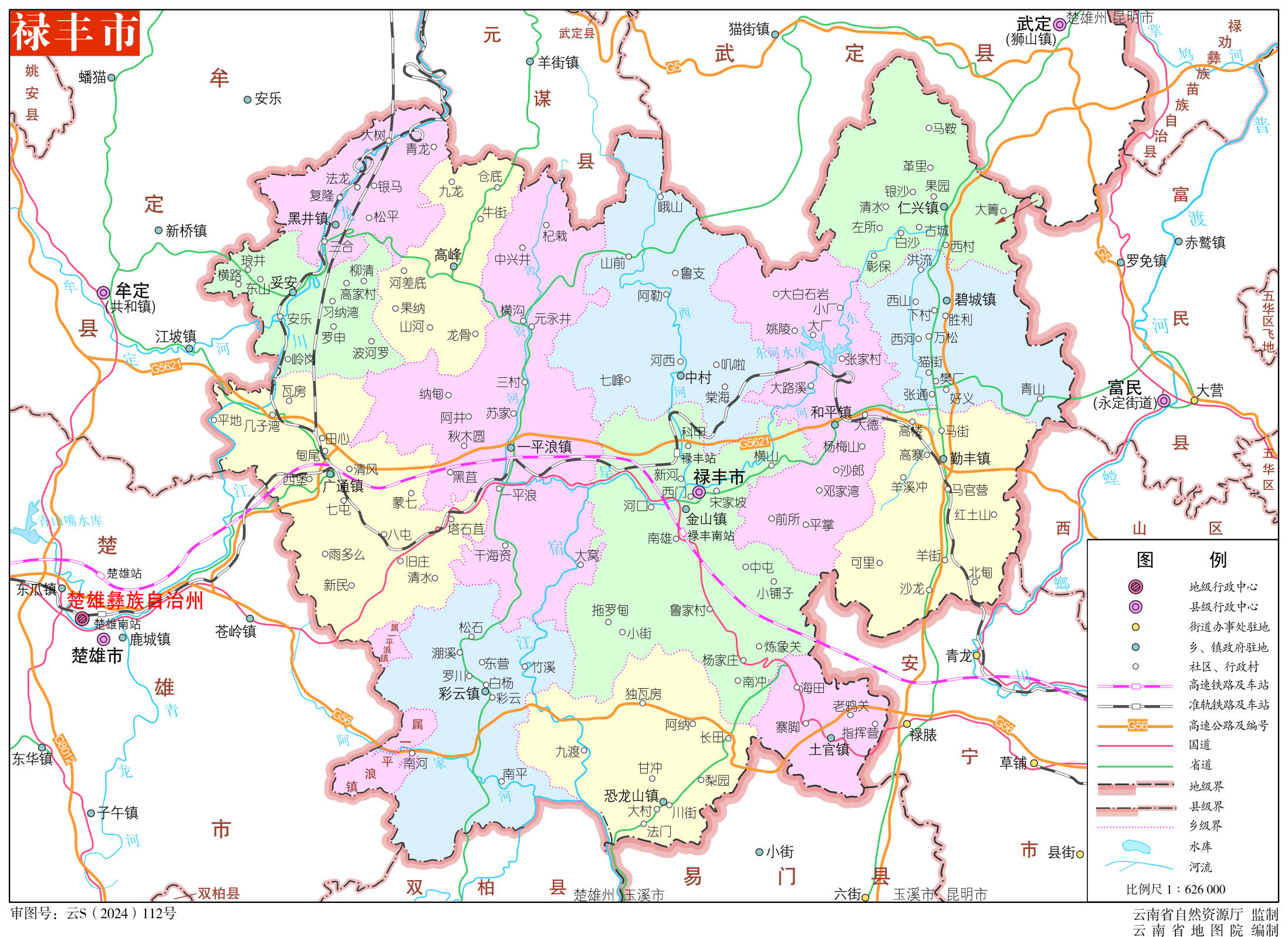 鎮(zhèn):金山鎮(zhèn)、廣通鎮(zhèn)、碧城鎮(zhèn)、仁興鎮(zhèn)、勤豐鎮(zhèn)、一平浪鎮(zhèn)、彩云鎮(zhèn)、土官鎮(zhèn)、黑井鎮(zhèn)、和平鎮(zhèn)、恐龍山鎮(zhèn)
